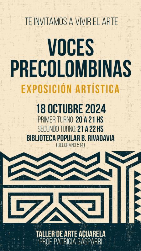 Este viernes 18 en la Biblioteca Popular "Bernardino Rivadavia" se llevará a cabo la Exposición "Voces Precolombinas" de los alumnos del "Taller Acuarela" a cargo de la Prof. Patricia Gasparri. La misma se dará en dos turnos a partir de las 20 y 21 hs