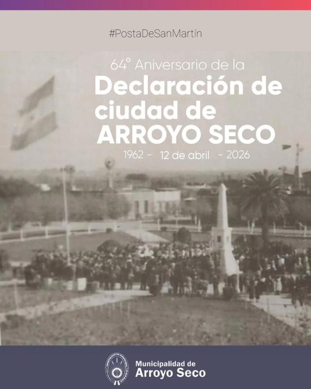 ??El 12 de ABRIL de 1962, “Arroyo Seco” se convierte en ciudad: Aprobadas las cifras provisionales arrojadas por el Censo Nacional de 1960, varias localidades de la provincia de Santa Fe registraron la cantidad de habitantes necesarias para ser elevadas a la categoría de Ciudad, según dictaba la Constitución Provincial y la Ley Orgánica de Municipalidades, y Arroyo Seco fue una de ellas, ciudad que había cambiado de Posta de San Martín a Arroyo Seco el año anterior. Hoy se cumplen 64 años de la declaración de Arroyo Seco como ciudad.