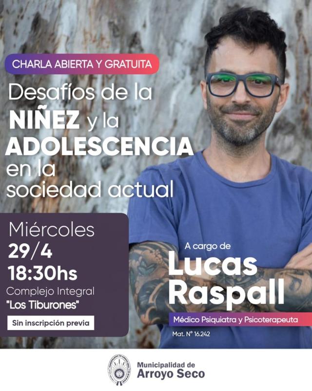 El próximo miércoles 29 de abril a las 18:30 se llevará a cabo una charla abierta sobre "Los desafíos de la niñez y la adolescencia en el contexto actual", a cargo de Lucas Raspall, médico psiquiatra y psicoterapeuta, reconocido por su trabajo en la divulgación y abordaje integral de la salud mental.